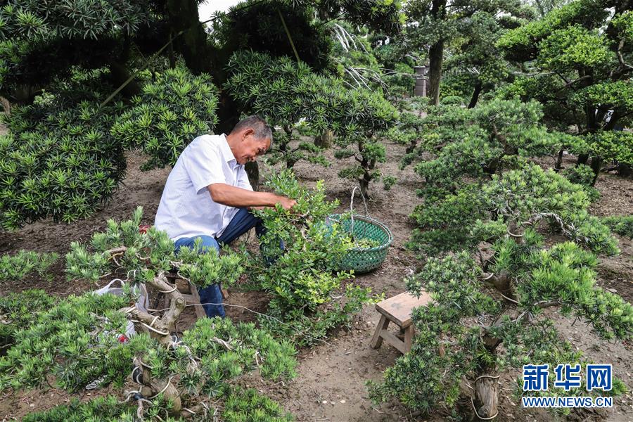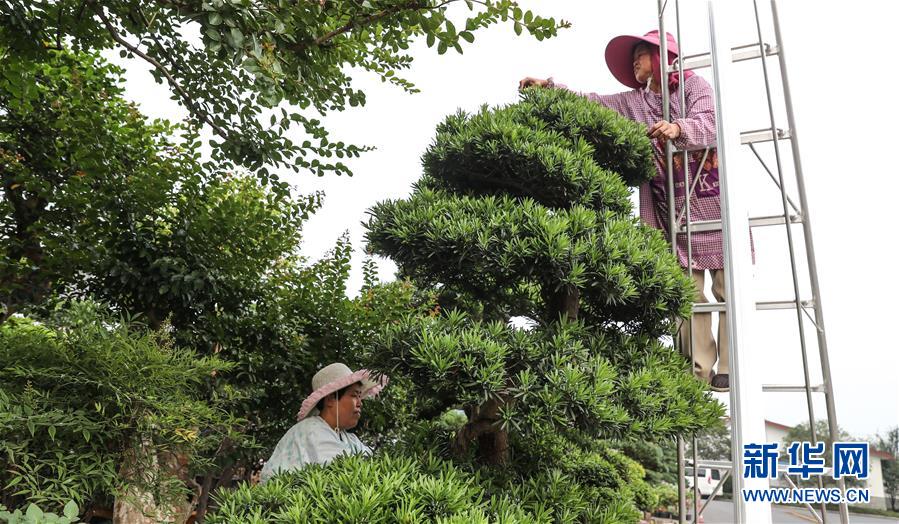 在如皋花木市場(chǎng),兩名園丁正在修剪苗木盆景(6月13日攝)。 新華社記者楊磊攝