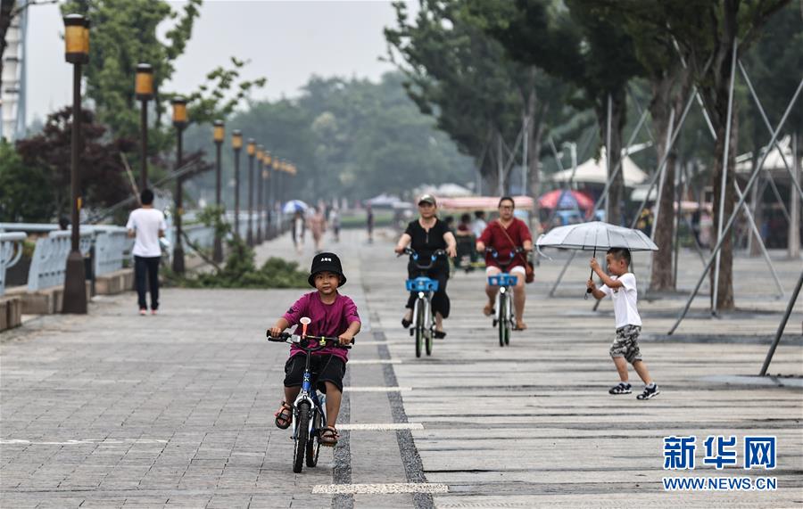 一名兒童與家人騎行在南通濱江觀光帶游覽(6月14日攝)。 新華社記者楊磊攝
