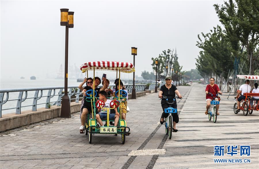 幾名游客正騎行在南通濱江觀光帶游覽(6月14日攝)。 新華社記者楊磊攝