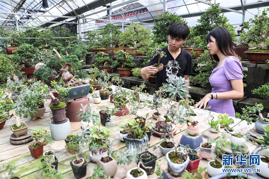 兩名游客在如皋花木市場(chǎng)挑選苗木盆景(6月13日攝)。 新華社記者楊磊攝