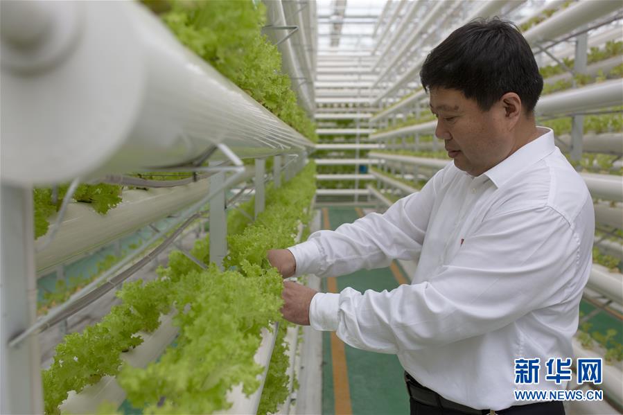 山東省蘭陵縣代村黨委書記王傳喜在查看無土栽培蔬菜長勢(6月18日攝)。新華社記者 王陽 攝