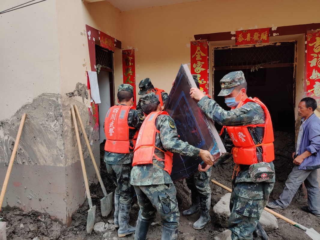 7月8日,在四川省阿壩州小金縣宅壟鎮(zhèn)元營(yíng)村城隍廟溝吉峰沙場(chǎng)山洪泥石流災(zāi)害現(xiàn)場(chǎng),武警四川省總隊(duì)阿壩支隊(duì)官兵幫助群眾搶救物資(手機(jī)拍攝)。新華社發(fā)(匡安勇 攝)