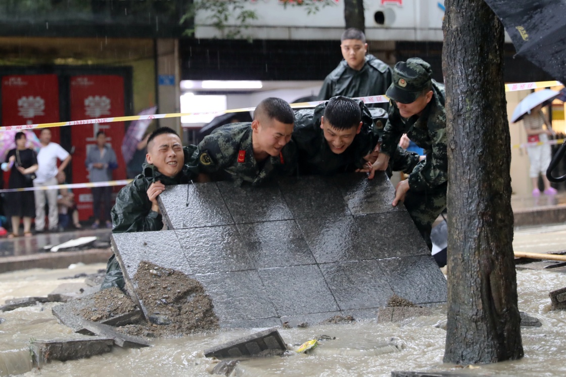 7月7日,重慶市黔江區(qū)城西街道出現(xiàn)大面積管涌險(xiǎn)情,武警重慶市總隊(duì)執(zhí)勤五支隊(duì)官兵在現(xiàn)場(chǎng)清理路面碎石。新華社發(fā)(蔣延圣 攝)