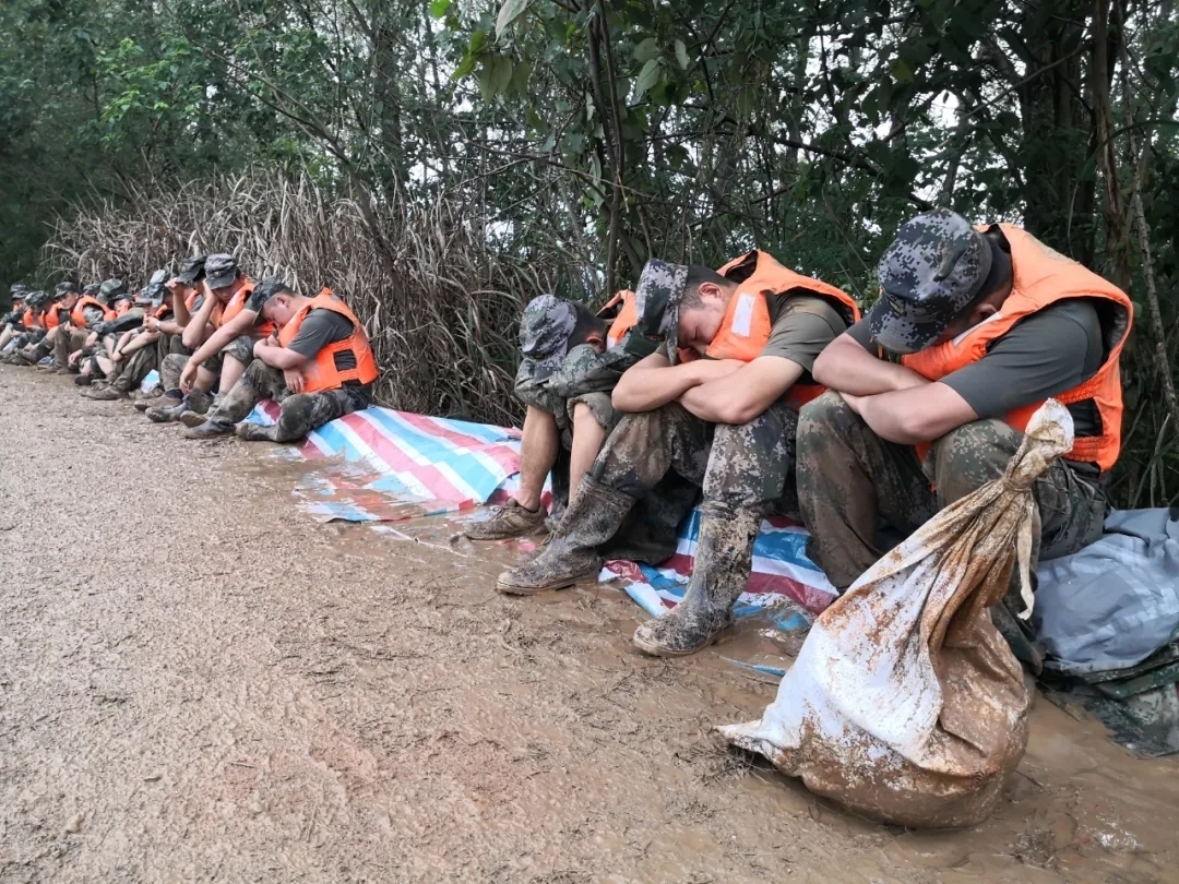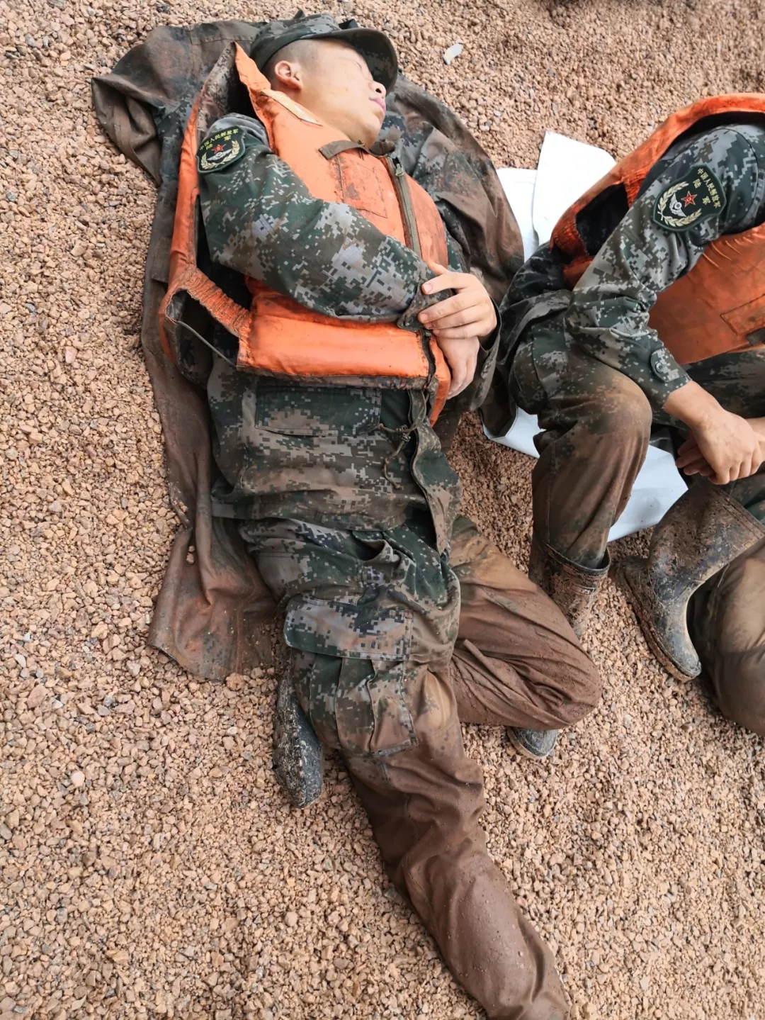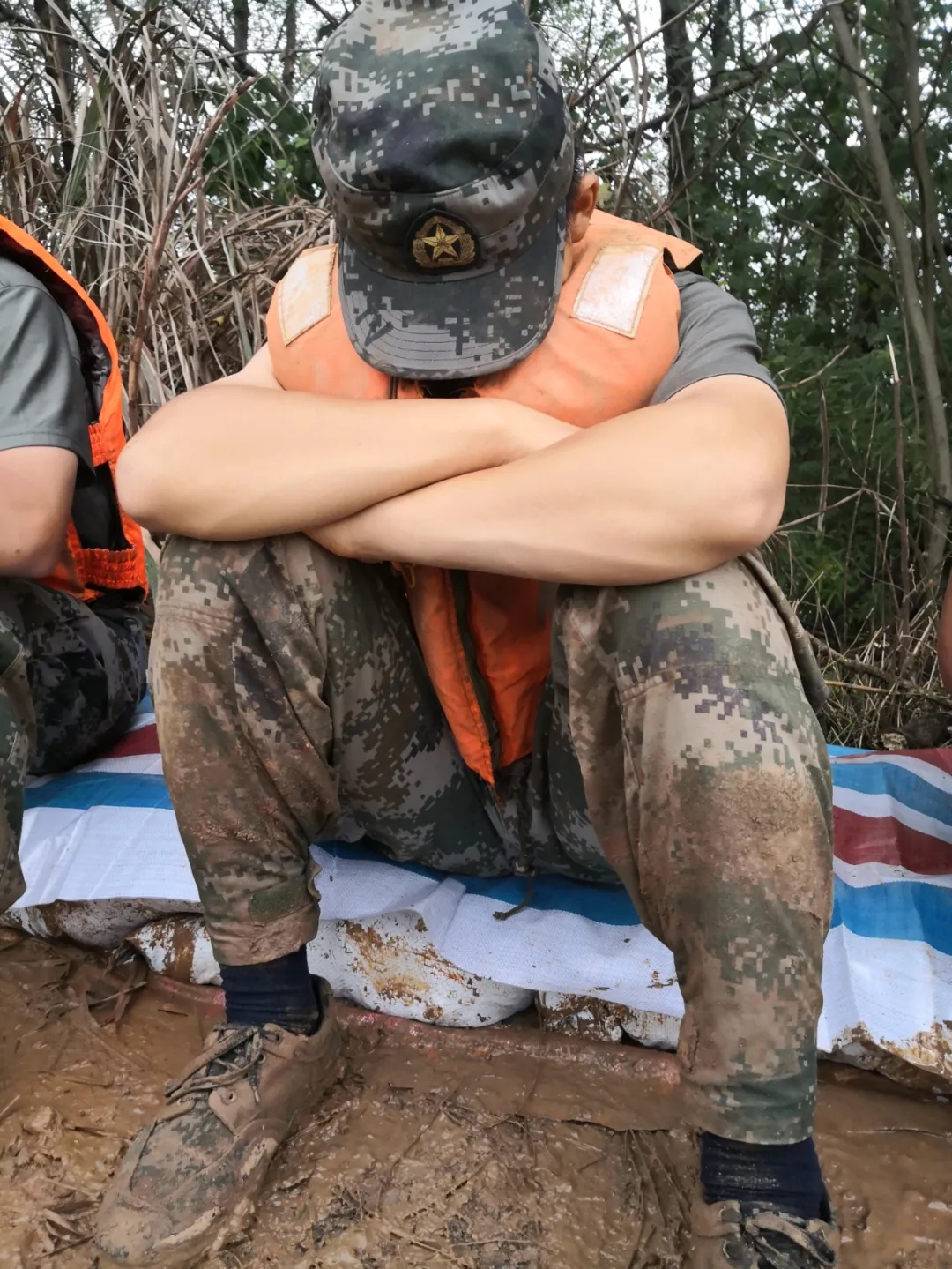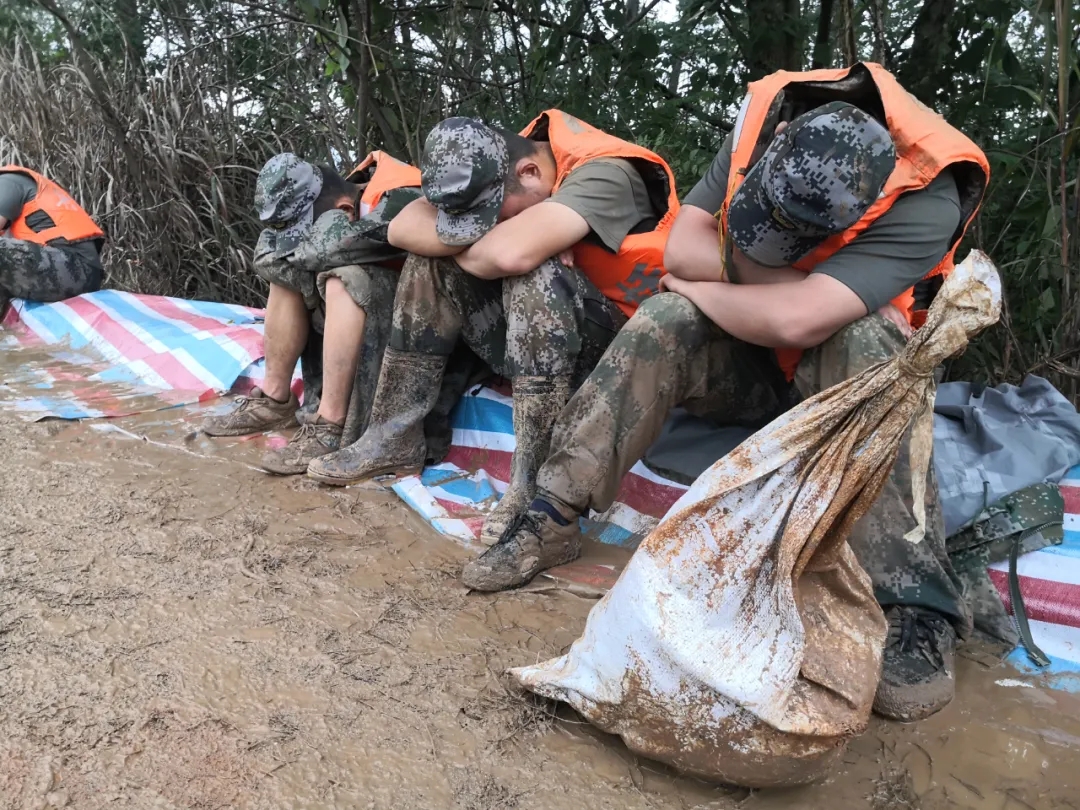 7月13日中午,湖北省武穴市金牛湖民堤上,剛處理完險(xiǎn)情的中部戰(zhàn)區(qū)陸軍某舟橋旅官兵滿身泥水,在大堤上短暫休息。