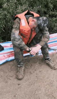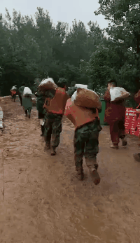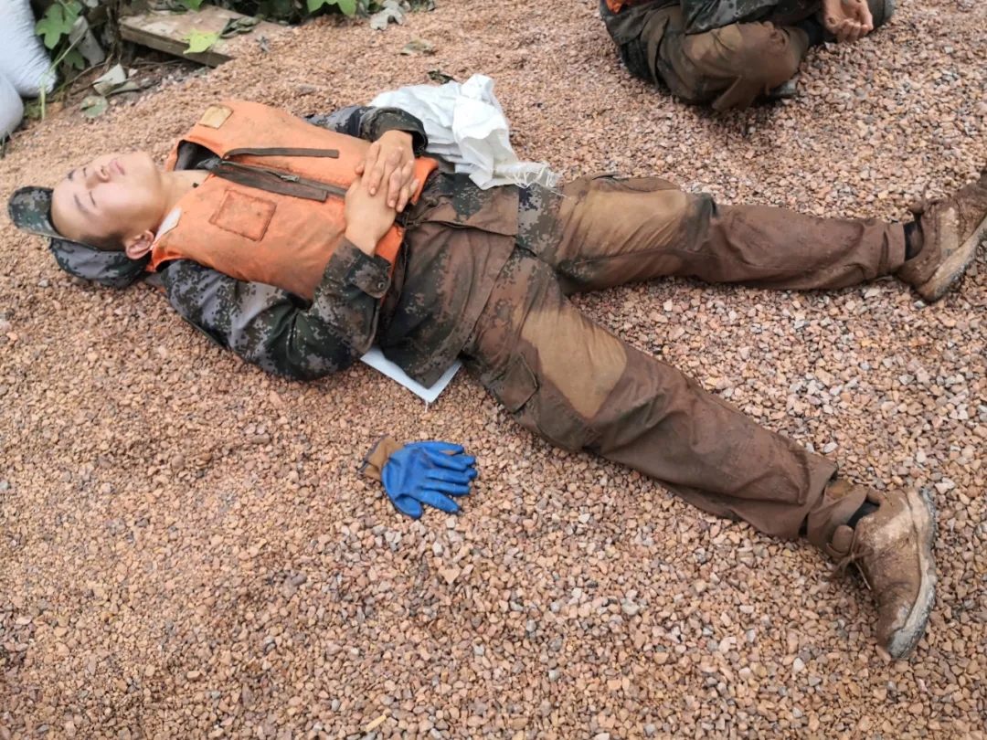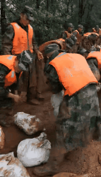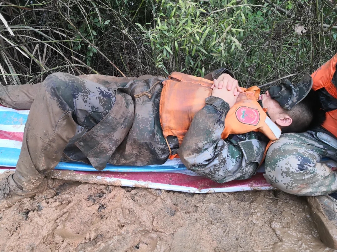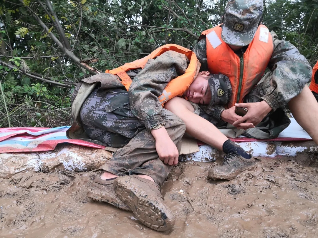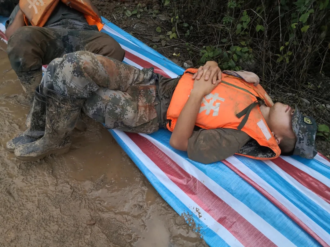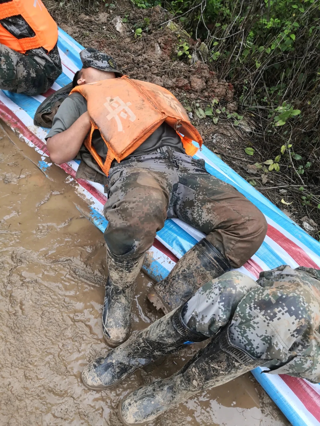 7月13日中午,湖北省武穴市金牛湖民堤上,剛處理完險(xiǎn)情的中部戰(zhàn)區(qū)陸軍某舟橋旅官兵滿身泥水,在大堤上短暫休息。