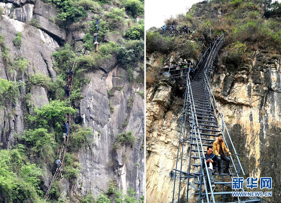 拼版照片:左圖為通往四川涼山彝族自治州昭覺(jué)縣阿土列爾村的簡(jiǎn)易藤梯(2016年5月14日攝);右圖為改建后的鋼梯(2017年12月5日攝)。新華社發(fā)(阿克鳩射 攝)