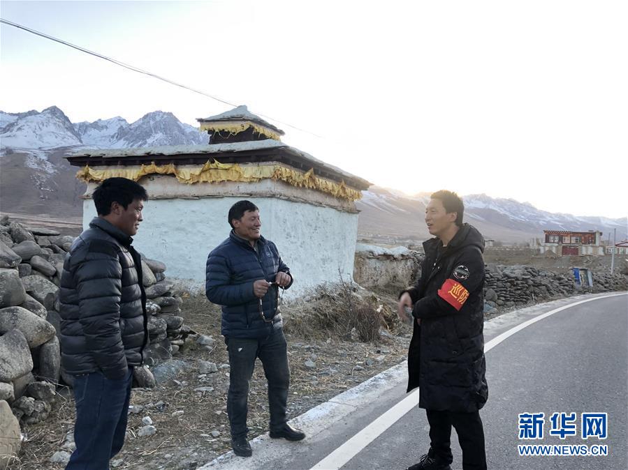 生前擔(dān)任甘孜州甘孜縣夏拉卡村駐村第一書(shū)記的馬伍薩(右)在巡防路上和村民交流(資料照片)。新華社發(fā)