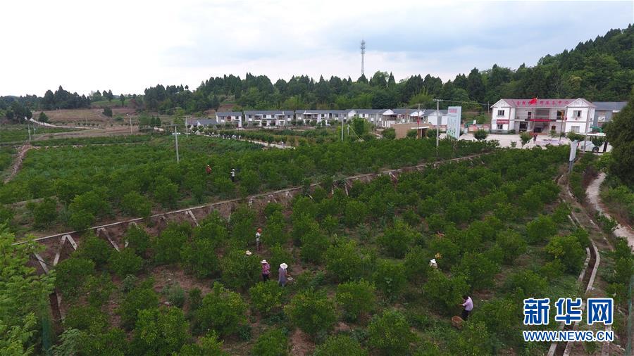 在四川省資陽(yáng)市樂(lè)至縣金鼓村,當(dāng)?shù)卮迕裨诖蚶砀涕贅?shù)(6月12日攝,無(wú)人機(jī)照片)。新華社記者 王曦 攝