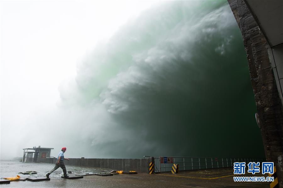 新安江電廠工作人員從正在泄洪的新安江水庫壩底經(jīng)過(7月7日攝)。 新華社記者 翁忻旸 攝
