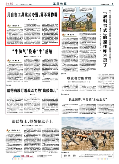最終,征求專家組意見后,旅黨委一致判定沈傳東成績有效。趁熱打鐵,該旅迅速掀起一場群眾性裝備技術(shù)革新活動,設(shè)立專項創(chuàng)新資金,鼓勵官兵立足現(xiàn)有裝備和條件,探索新訓(xùn)法,開發(fā)新器材。同時,組織專家組對小革新小發(fā)明進行檢驗,篩選出具有實戰(zhàn)價值的成果進行推廣。