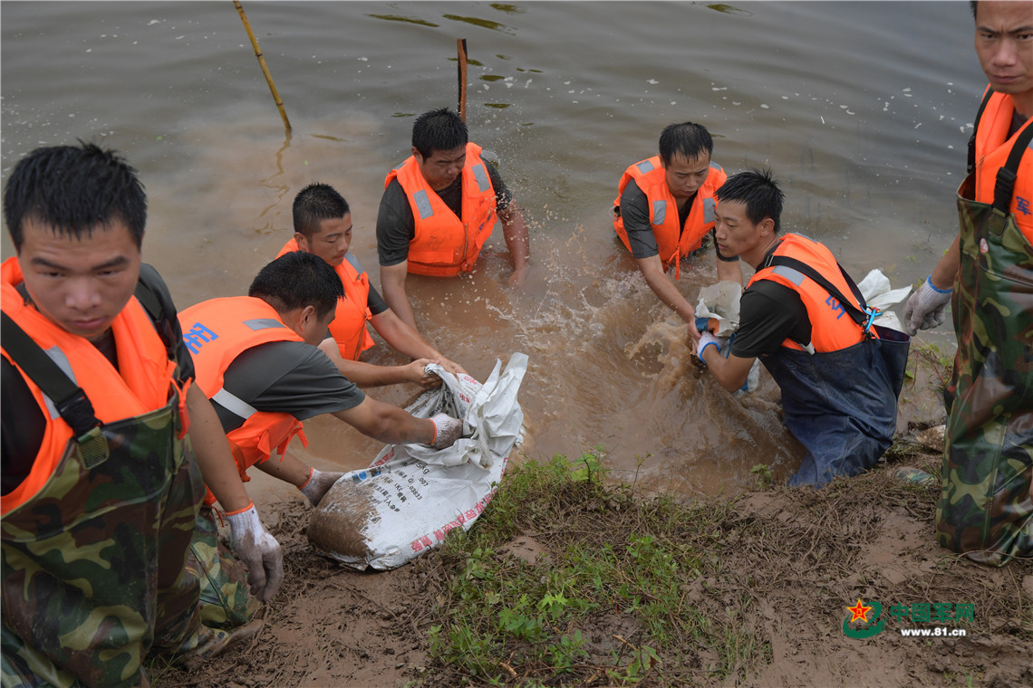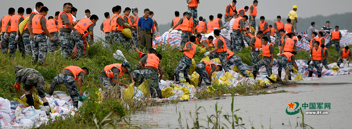 7月19日上午,長江流域九江段水位出現(xiàn)小幅上漲,官兵接令緊急出動,對江洲鎮(zhèn)蔡洲村堤壩進(jìn)行防浪處理。他們以5人為一個小組,分別負(fù)責(zé)防水布條的鋪設(shè)、壓實、裝填搬運沙土等工作。