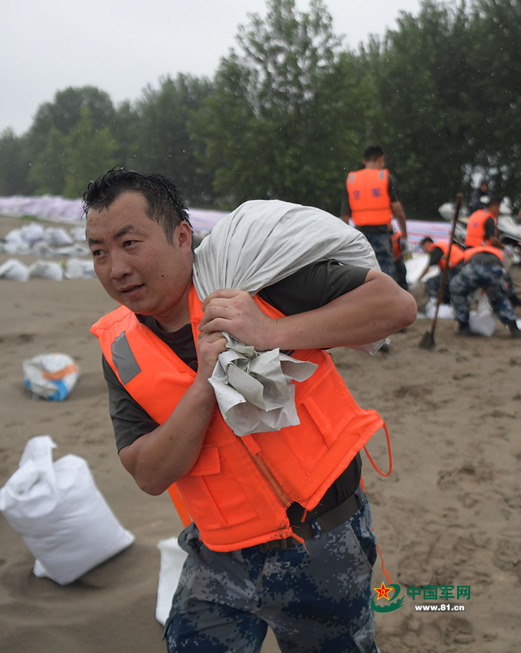 大堤上,別人休息的時候,炊事班長吳鵬仍在搬運沙袋。余紅春 攝