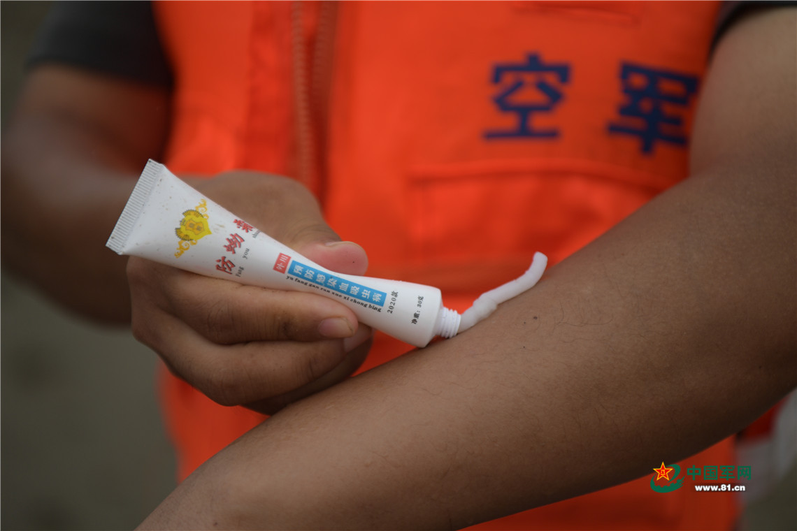 下水作業(yè)前,官兵涂抹預(yù)防血吸蟲藥膏。余紅春 攝