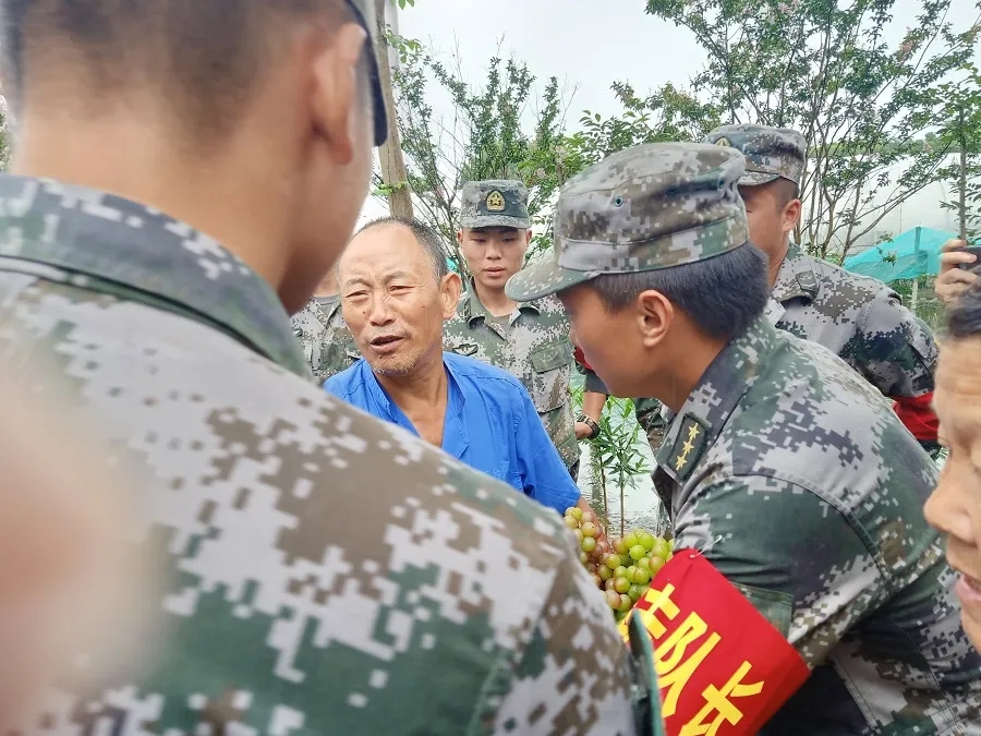 7月24日上午,加固完安徽巢湖泄洪水道的第71集團(tuán)軍某旅某連官兵在加強(qiáng)兄弟單位任務(wù)區(qū)返回途中,路過三河鎮(zhèn)木蘭社區(qū)一處農(nóng)家葡萄園時,發(fā)現(xiàn)一位大娘兩眼無助地看著他們?!按竽锇l(fā)生什么事了嗎?有什么需要幫助的嗎?”帶隊的連長張雙進(jìn)覺得這位大娘的眼神讓人心疼,便上前詢問事由。