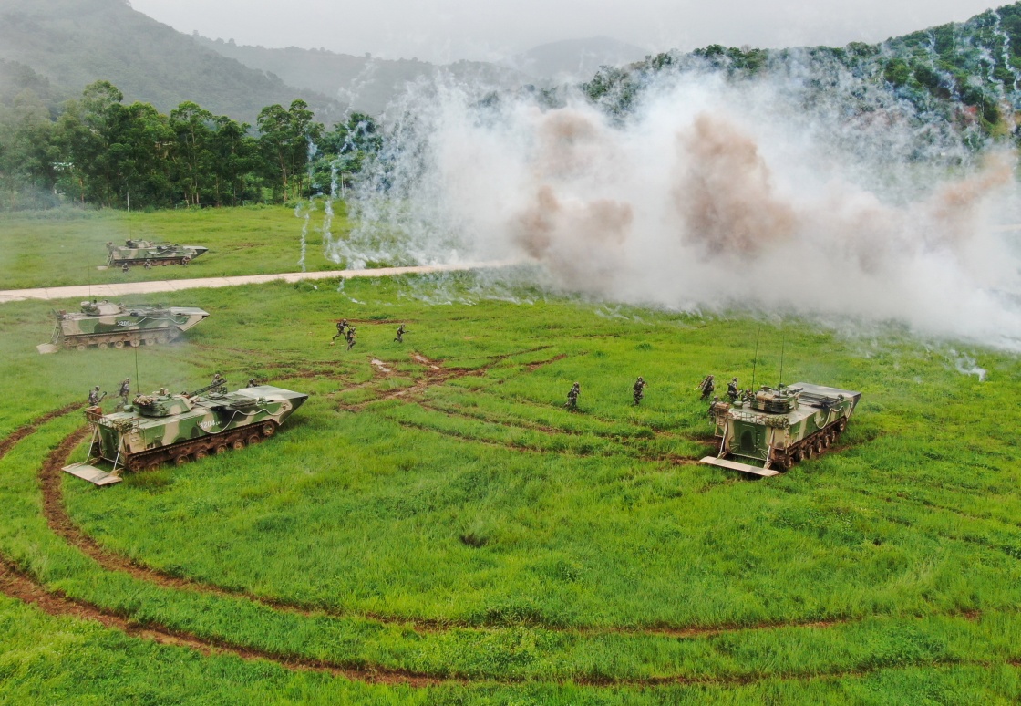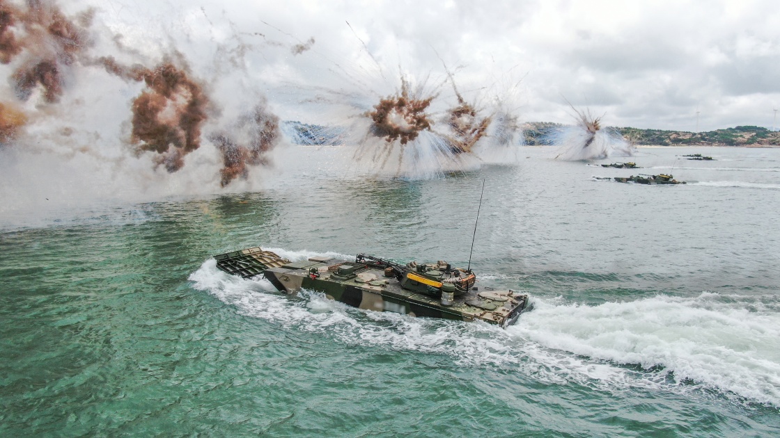 “硬骨頭六連”進行海上實戰(zhàn)化訓(xùn)練,兩棲步戰(zhàn)車在煙幕掩護下快速沖擊(6月1日攝)。新華社發(fā)(李彬 攝)