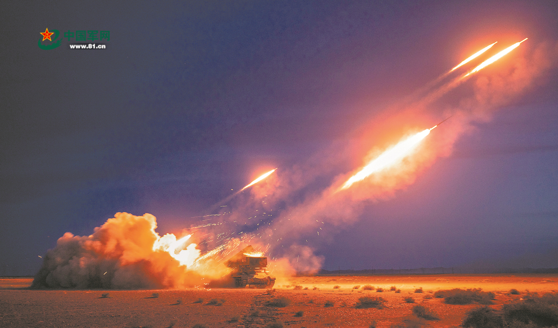 指揮車內(nèi),一道道指令急速傳向各戰(zhàn)位。隨著射擊口令下達(dá),陣地上硝煙滾滾,一條條“火龍”呼嘯著劃破天空。經(jīng)過(guò)兩輪火力打擊,“敵”目標(biāo)陷于一片火海之中。