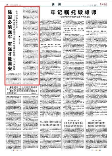 八一建軍節(jié)前夕,中共中央政治局就加強國防和軍隊現(xiàn)代化建設舉行第二十二次集體學習,習主席主持學習并發(fā)表重要講話。習主席的重要講話,站在堅持和發(fā)展中國特色社會主義、實現(xiàn)中華民族偉大復興的戰(zhàn)略高度,深刻闡述了統(tǒng)籌發(fā)展和安全、富國和強軍的重大意義,總結回顧了我黨我軍積極推進國防和軍隊現(xiàn)代化建設的非凡歷程、戰(zhàn)略安排和巨大成就,科學分析了當前國際戰(zhàn)略形勢和國內(nèi)安全環(huán)境,并對實現(xiàn)國防和軍隊建設2020年目標任務提出明確要求,作出具體部署,為推進國防和軍隊現(xiàn)代化建設指明了方向、提供了遵循。