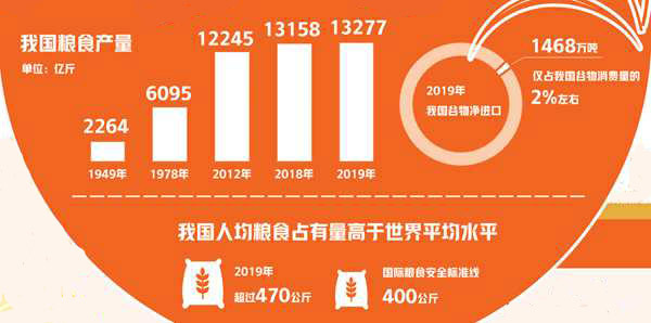 程國強(qiáng):解決好吃飯問題,是中國人千百年來夢寐以求的目標(biāo)。新中國成立后特別是改革開放以來,在中國共產(chǎn)黨的領(lǐng)導(dǎo)下,我國經(jīng)過艱苦奮斗和不懈努力,在農(nóng)業(yè)基礎(chǔ)十分薄弱、資源條件極其有限的基礎(chǔ)上,依靠自身力量,實(shí)現(xiàn)了由“吃不飽”向“吃得飽”,進(jìn)而追求“吃得好”的歷史性轉(zhuǎn)變。這既是世界糧食安全的巨大成就,也是全球農(nóng)業(yè)的歷史奇跡。統(tǒng)計(jì)數(shù)據(jù)顯示,1949年,我國糧食產(chǎn)量只有1.1318億噸左右,人均糧食占有量只有209公斤;2019年,我國糧食產(chǎn)量已經(jīng)連續(xù)多年突破6.5億噸,人均糧食占有量上升至470公斤,比新中國成立時(shí)的209公斤增長了126%,高于世界平均水平。目前,我國谷物自給率超過95%,水稻和小麥兩大口糧自給率超過100%,中國人已經(jīng)將“飯碗”牢牢端在了自己手上。