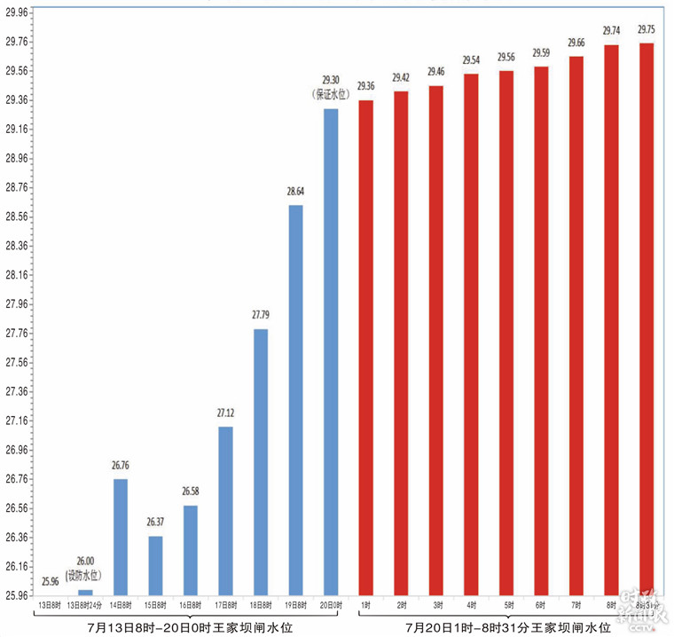 △今年7月13日—20日王家壩閘水位變化柱狀圖。(資料圖)