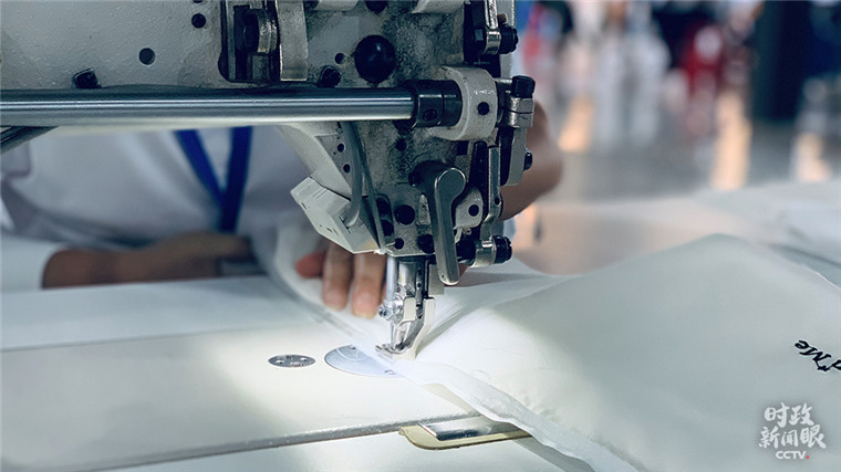 △正在縫制中的書包(總臺央視記者邢彬拍攝)