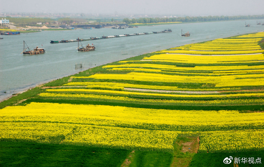 2008年3月27日,一支運煤船隊通過岸邊開滿油菜花的淮河淮南段。金黃色的油菜花和綠油油的麥苗使得淮河岸邊美景如畫。新華社發(fā)(陳彬攝)