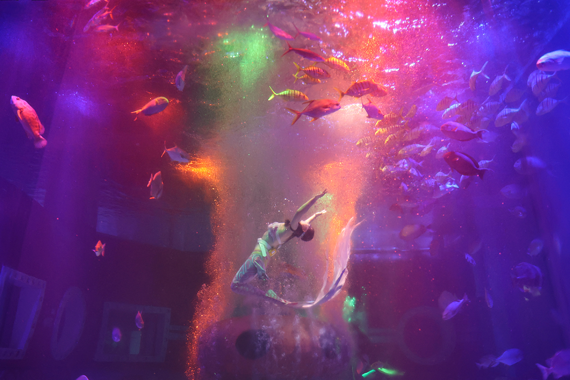 9月25日,演員在哈爾濱極地館表演冰海人魚鰩魚秀。
