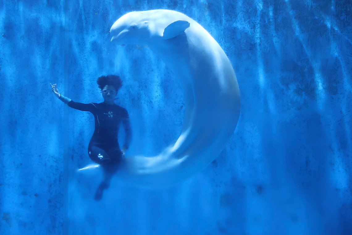 9月25日,在哈爾濱極地館,馴養(yǎng)師與白鯨表演“嫦娥奔月”。