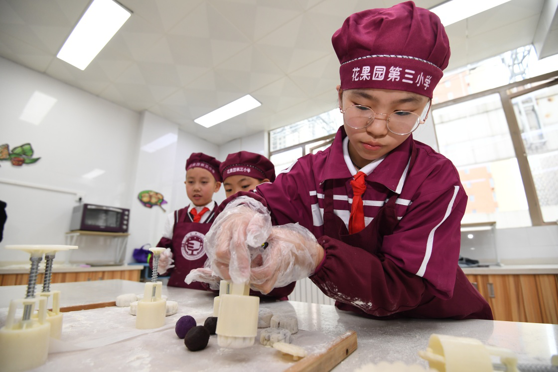 9月24日,貴陽(yáng)市南明區(qū)花果園第三小學(xué)的學(xué)生制作冰皮月餅。