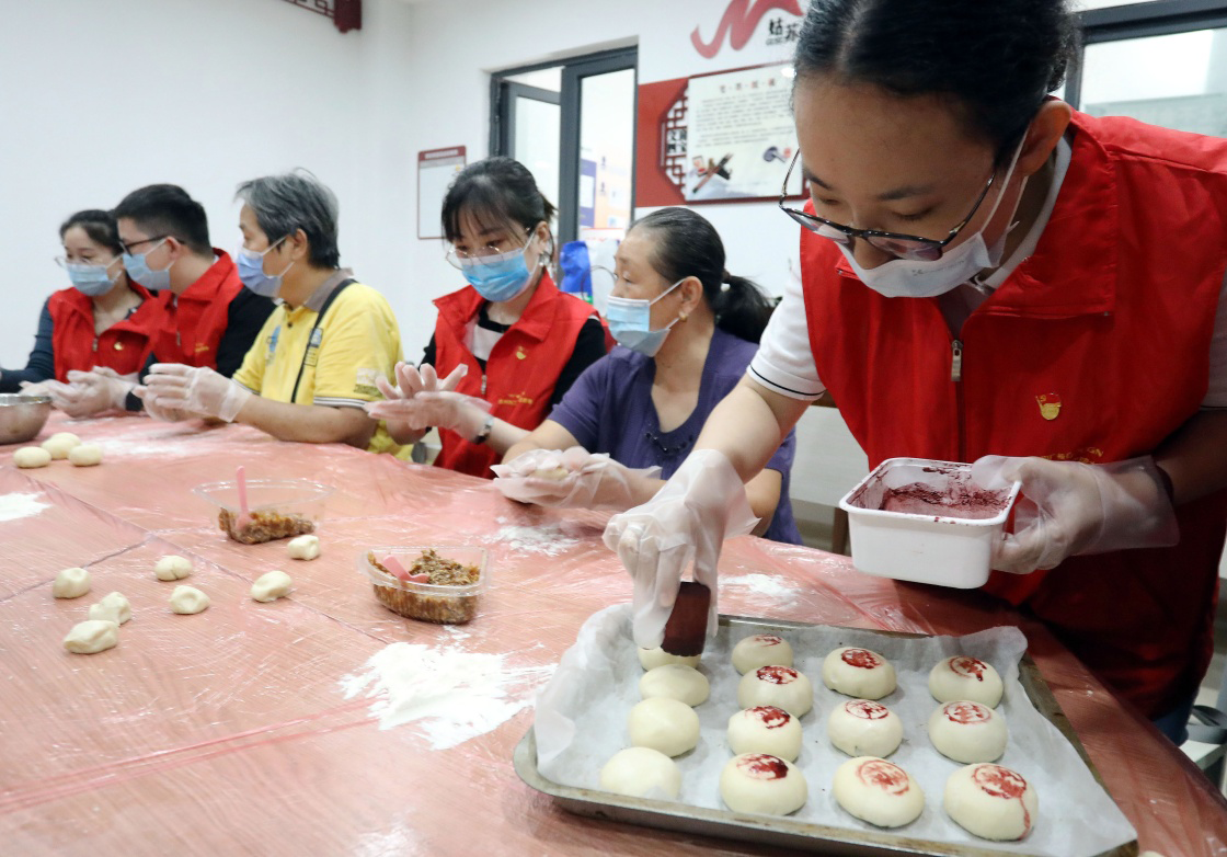 當日,在江蘇省蘇州市姑蘇區(qū)金閶街道三元四村社區(qū),青年志愿者和社區(qū)居民一起制作月餅,并將做好的月餅送發(fā)給社區(qū)老人,共迎中秋佳節(jié)的到來。