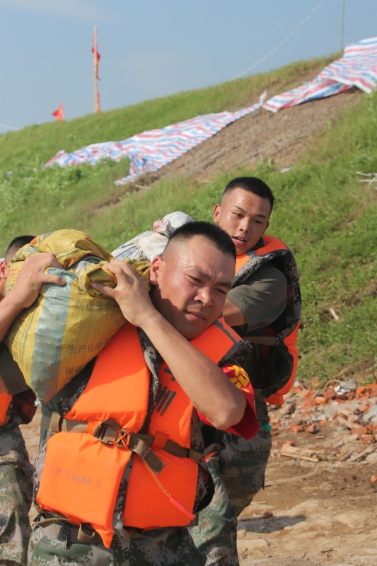 陸軍第71集團(tuán)軍某旅“王杰班”官兵在江西九江涂山圩第9段大堤搬運(yùn)沙袋加固堤壩(2020年7月22日攝)。新華社發(fā)(李志浩 攝)