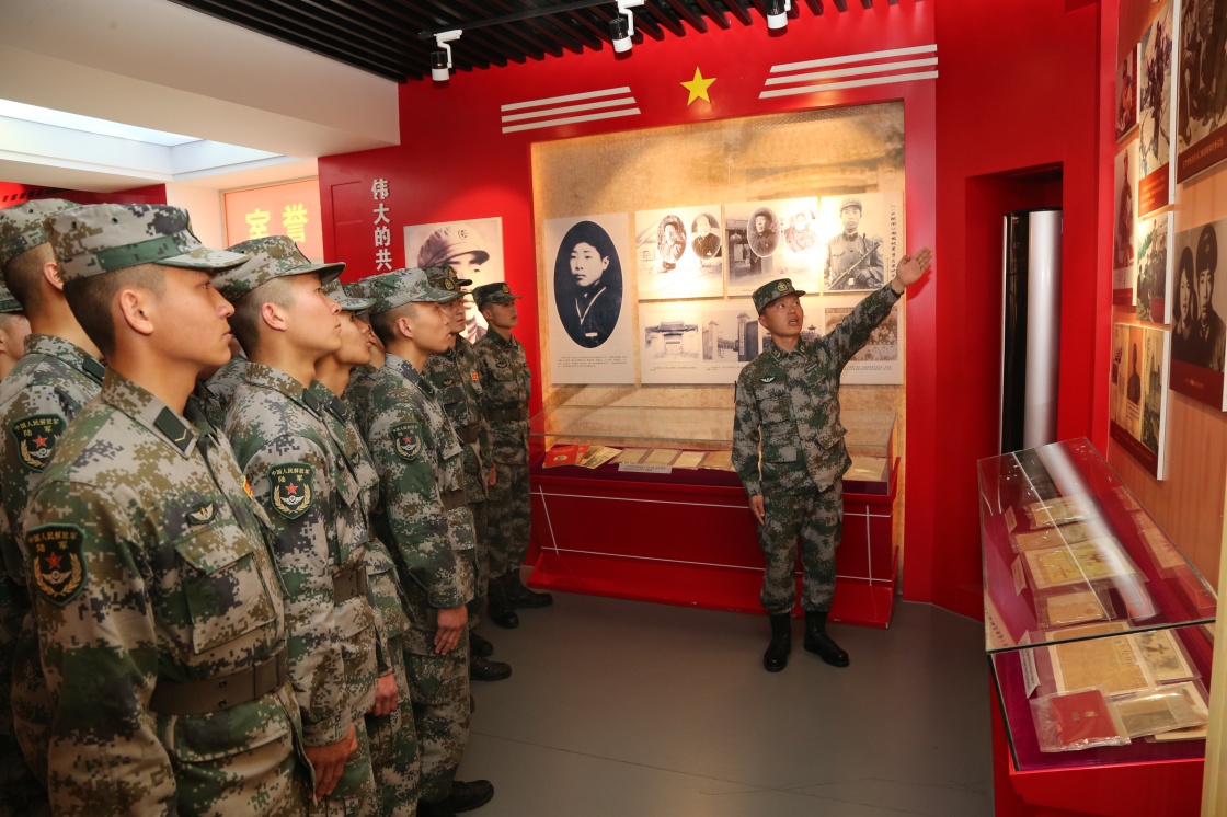 陸軍第71集團(tuán)軍某旅“王杰班”班長(zhǎng)王大毛(右)在連隊(duì)榮譽(yù)室給新入伍的戰(zhàn)友講解王杰事跡(2019年4月5日攝)。新華社發(fā)(李志浩 攝)
