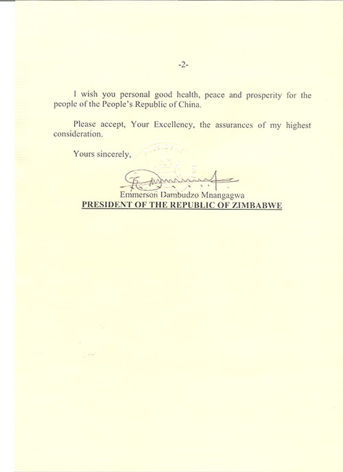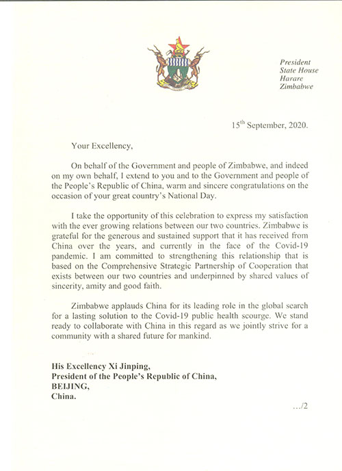 近日,津巴布韋總統(tǒng)姆南加古瓦向中方致賀信,祝賀中華人民共和國成立71周年。