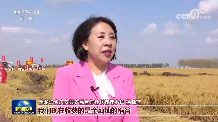 黑龍江省慶安縣農(nóng)民合作社聯(lián)社理事長(zhǎng) 楊曉萍:我們現(xiàn)在收獲的是金燦燦的稻谷,為祖國(guó)獻(xiàn)禮。