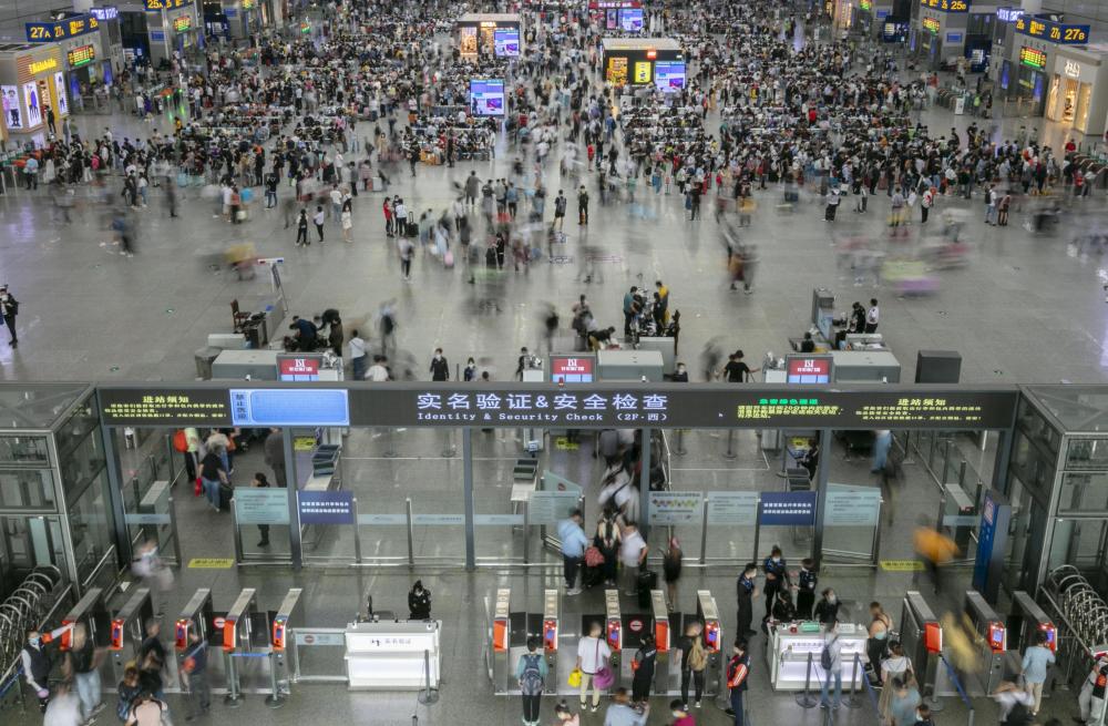 圖為10月2日拍攝的上海虹橋火車站候車大廳。(新華社記者王翔攝)