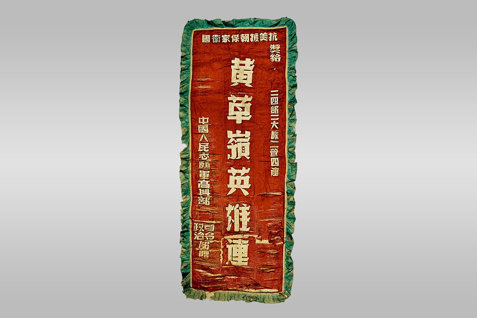 這是志愿軍某部頒發(fā)給三七〇團四連的“黃草嶺英雄連”獎旗。黃草嶺位于朝鮮長津湖以南約20千米,是志愿軍的前沿陣地。1950年10月25日,志愿軍四十二軍為阻擊東線之敵,派先頭部隊搶占黃草嶺,隨后該軍三七〇團四連奉命守衛(wèi)黃草嶺796.5高地。10月28日和29日,四連在守衛(wèi)黃草嶺戰(zhàn)斗中共擊退敵人進攻20次,斃傷敵軍250余人。戰(zhàn)后,四連被授予“黃草嶺英雄連”稱號,并獲贈獎旗。