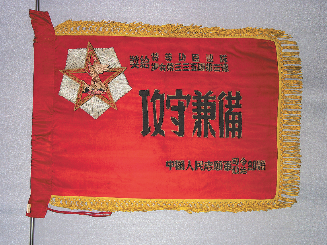 十一前夕,筆者參觀位于遼寧丹東的抗美援朝紀念館。在戰(zhàn)爭廳,被摩肩接踵的人流擋住了去路。從大家輕聲議論中,筆者捕捉到幾個關鍵詞,再順著他們的目光看去,一面鮮紅的獎旗被罩在墻上的玻璃龕柜里,旗面上“攻守兼?zhèn)洹?個大字格外醒目。