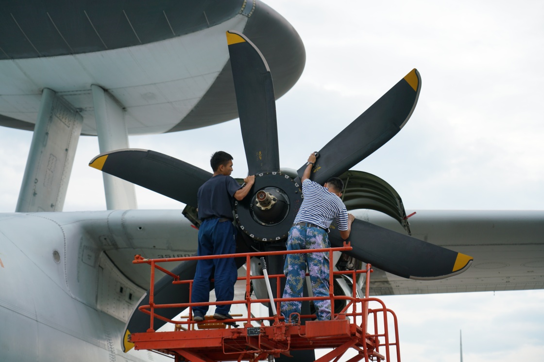 南部戰(zhàn)區(qū)海軍航空兵某師官兵對(duì)戰(zhàn)機(jī)螺旋槳槳帽進(jìn)行檢查保養(yǎng)(8月27日攝)。新華社發(fā)(邱曉濤 攝)