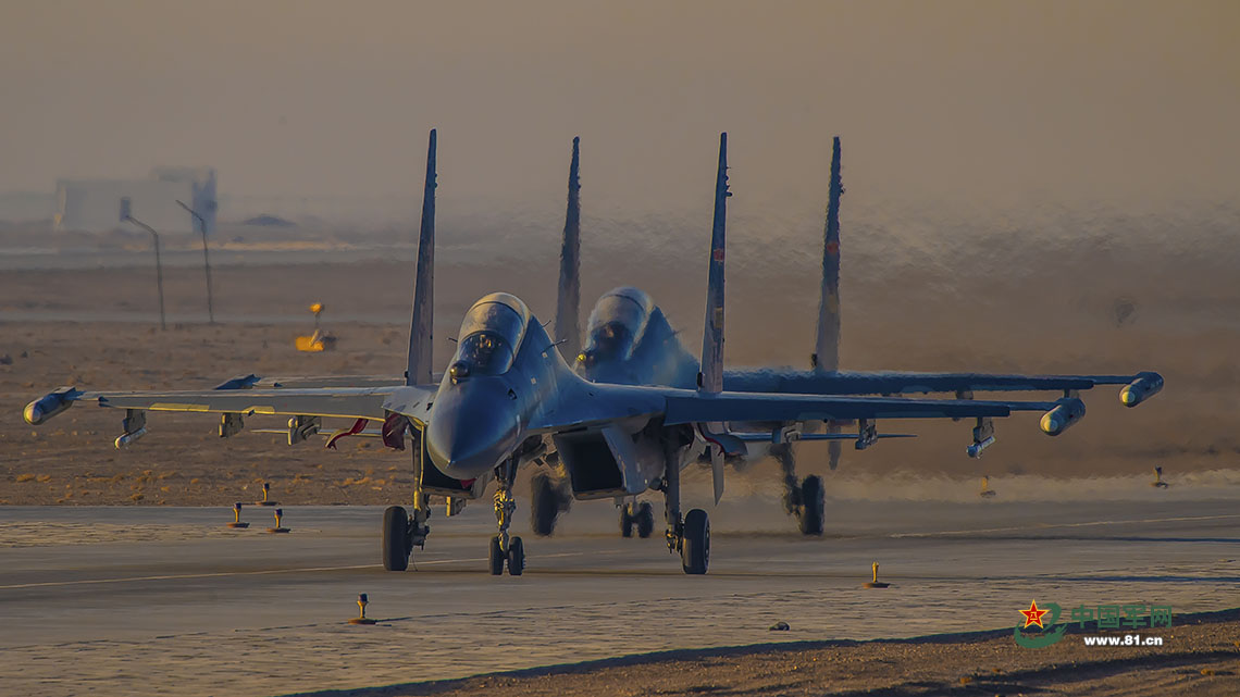 基地某部殲-16戰(zhàn)機(jī)編隊(duì)出征。楊軍 攝