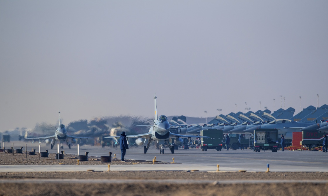在空軍某試驗(yàn)訓(xùn)練基地組織的“紅劍”演習(xí)中,兩架殲-10C戰(zhàn)機(jī)滑出(2019年11月30日攝)。新華社發(fā)(楊軍 攝)