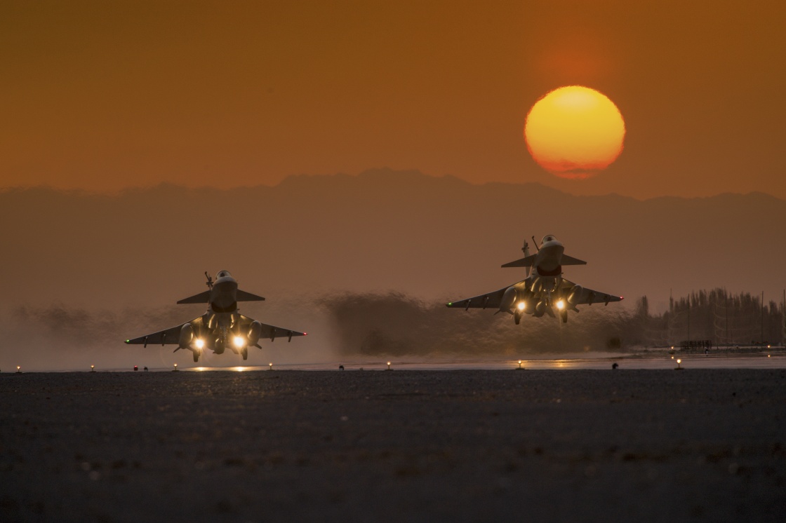 在空軍某試驗(yàn)訓(xùn)練基地的訓(xùn)練場(chǎng)上,殲-10C戰(zhàn)機(jī)進(jìn)行跨晝夜對(duì)抗訓(xùn)練(2018年5月22日攝)。新華社發(fā)(楊軍 攝)