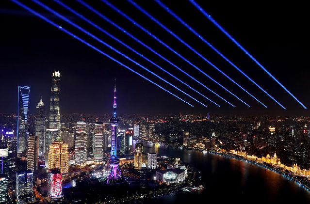 10月26日,幾束射燈光從上海白玉蘭廣場頂樓照向夜空。第三屆中國國際進口博覽會將于11月5日至10日在上海舉辦。近日,上海迎接盛會的各項籌備工作在緊鑼密鼓地進行中,浦江兩岸將在進博會開幕當天上演精彩燈光秀。(新華社記者方喆攝)
