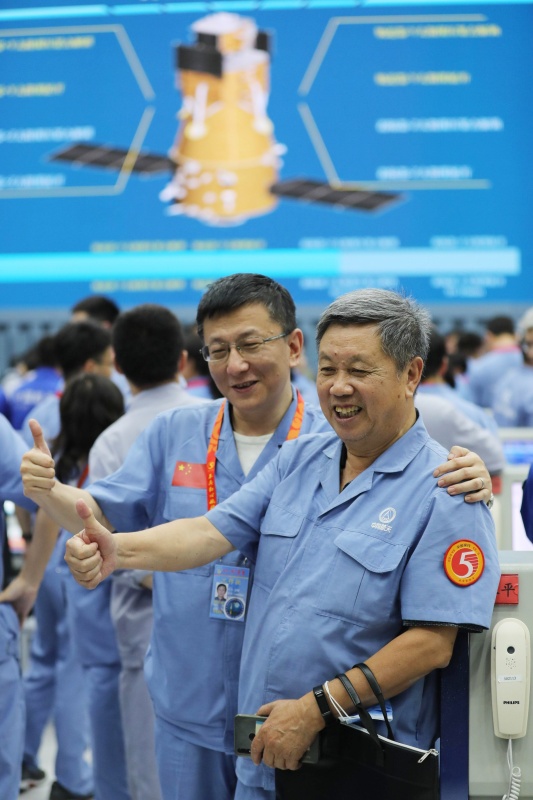 11月24日4時(shí)30分,我國(guó)在中國(guó)文昌航天發(fā)射場(chǎng),用長(zhǎng)征五號(hào)遙五運(yùn)載火箭成功發(fā)射探月工程嫦娥五號(hào)探測(cè)器,火箭飛行約2200秒后,順利將探測(cè)器送入預(yù)定軌道,開(kāi)啟我國(guó)首次地外天體采樣返回之旅。這是航天科技人員在文昌航天發(fā)射場(chǎng)慶祝發(fā)射成功。