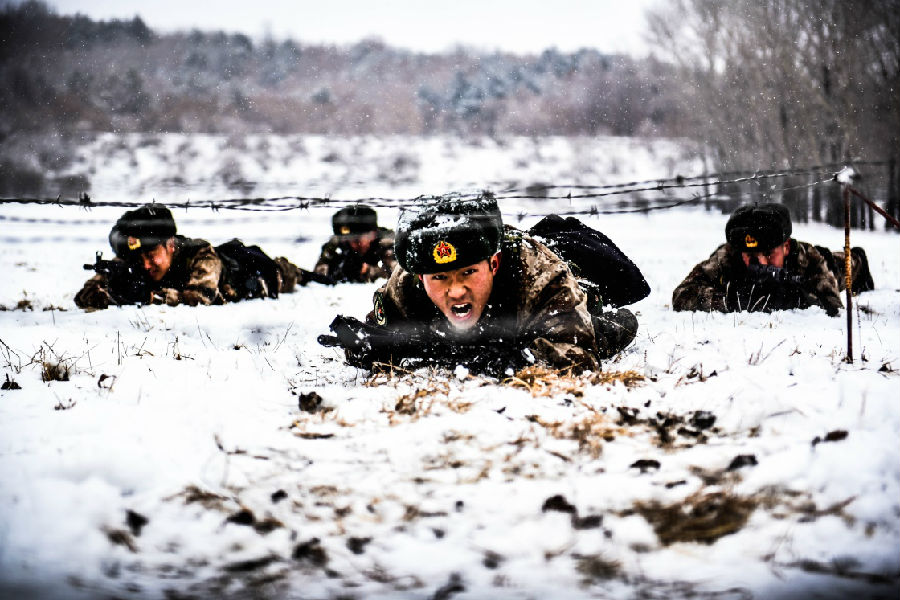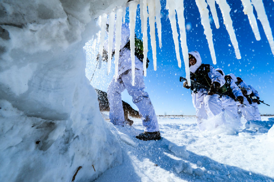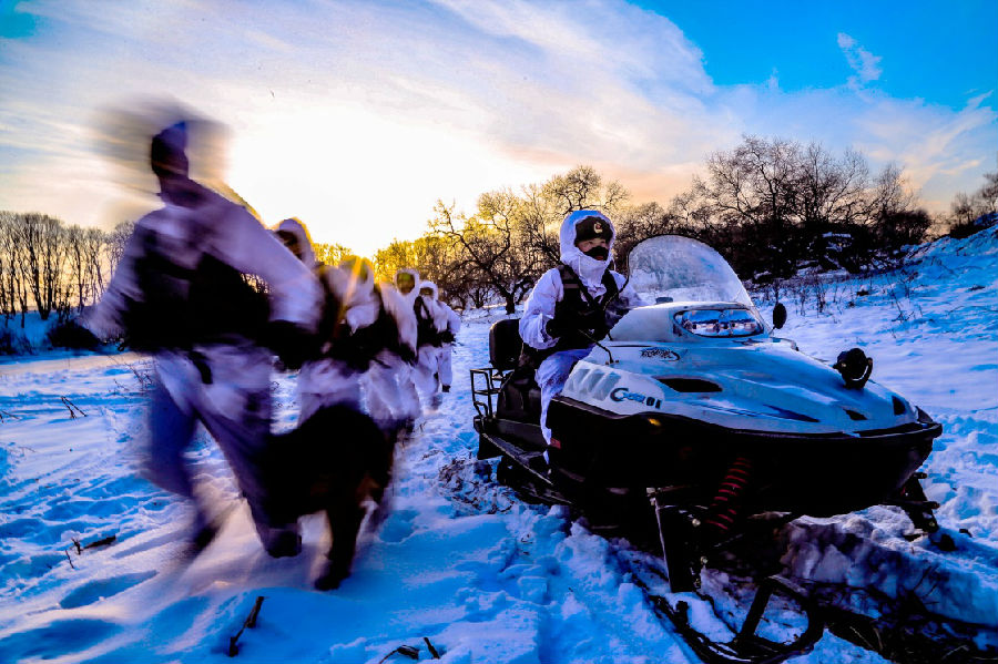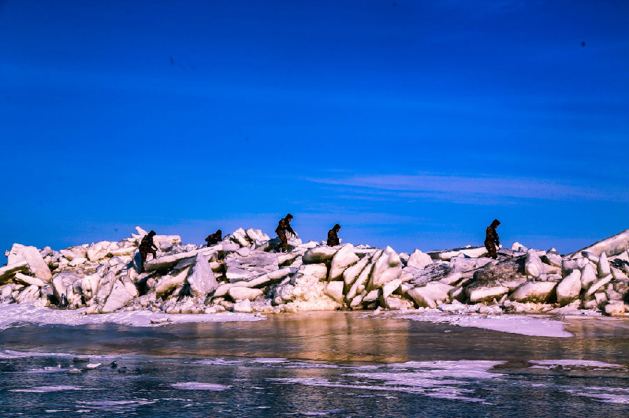 東極哨所組織邊境守防演練,官兵們?cè)谘策墸?1月4日攝)。新華社發(fā)(李寶成 攝)