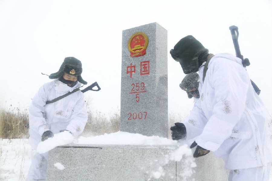 東極哨所官兵清理界碑上的積雪(2017年11月15日攝)。新華社發(fā)(李寶成 攝)