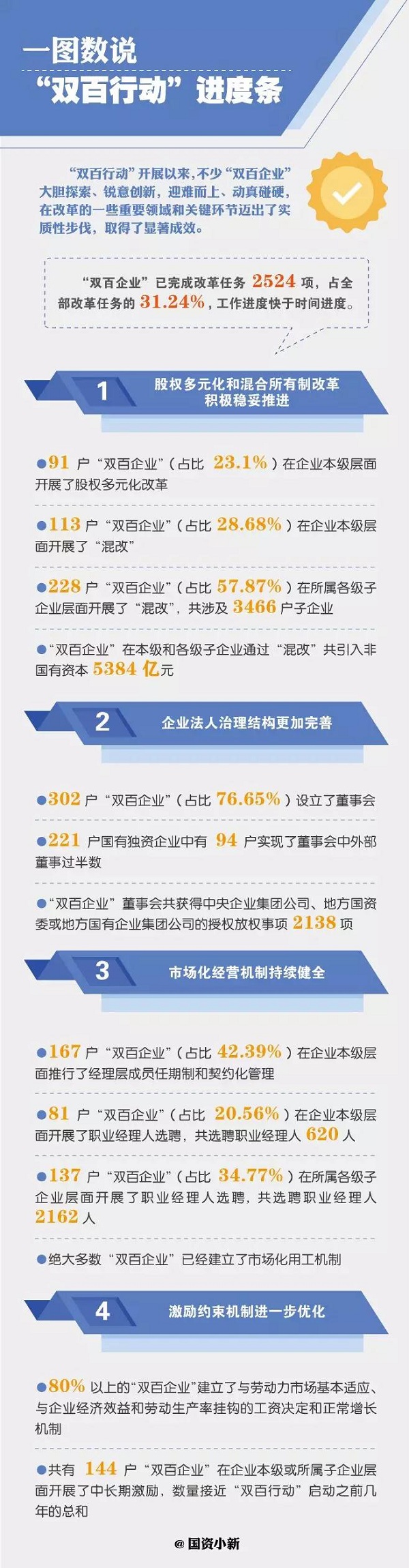 自去年8月正式啟動(dòng)以來,“雙百行動(dòng)”相關(guān)頂層設(shè)計(jì)和改革實(shí)施不斷向前推進(jìn)。目前,共有444戶央企子企業(yè)和地方國(guó)有骨干企業(yè)入圍“雙百企業(yè)”名單,“雙百企業(yè)”已累計(jì)完成全部改革任務(wù)的30%以上,工作進(jìn)度快于時(shí)間進(jìn)度,并在不少重要領(lǐng)域邁出實(shí)質(zhì)性步伐。