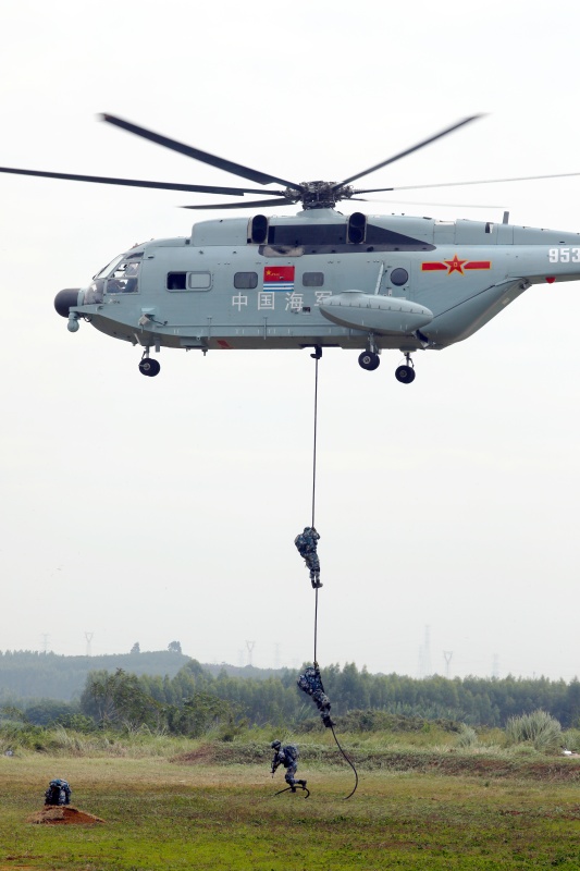 演練中,海軍陸戰(zhàn)隊某旅機降分隊隊員從直升機上滑降登陸(2020年10月12日攝)。新華社發(fā)(姚冠辰 攝)