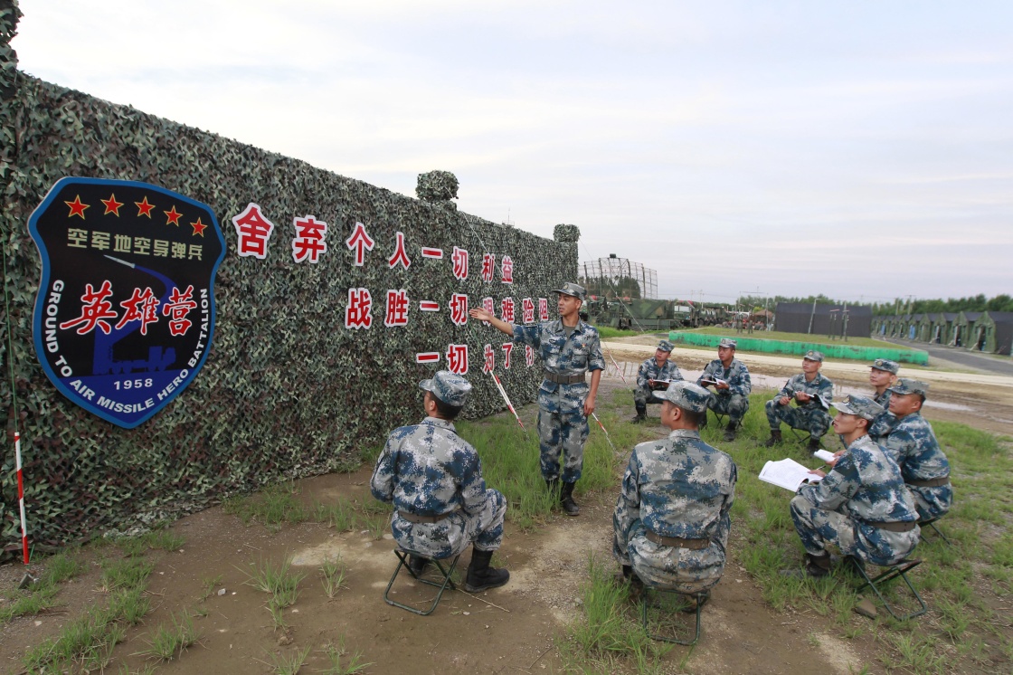 中部戰(zhàn)區(qū)空軍地空導(dǎo)彈某旅“英雄營”教導(dǎo)員袁天姣(站立者)為官兵講述“英雄營”精神(2020年8月20日攝)。新華社發(fā)(劉川 攝)