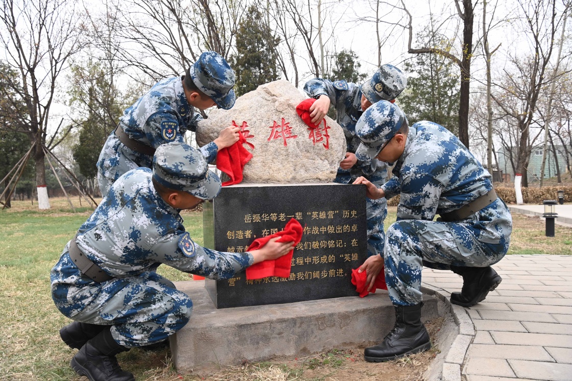 中部戰(zhàn)區(qū)空軍地空導(dǎo)彈某旅“英雄營”官兵在擦拭“英雄樹”石碑(4月1日攝)。新華社發(fā)(劉川 攝)