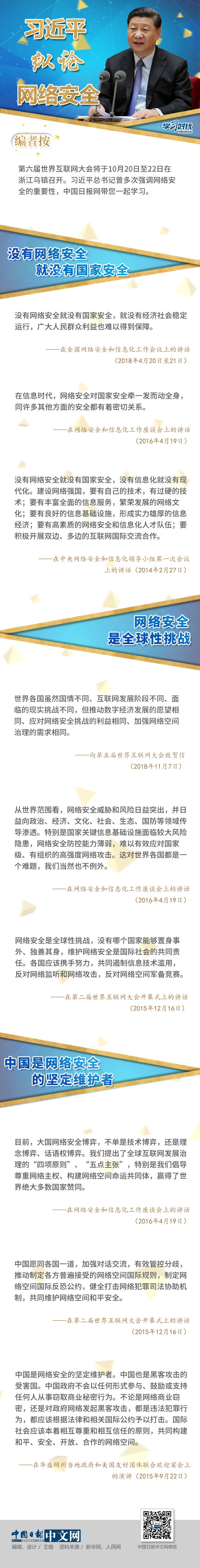 ?編者按:第六屆世界互聯(lián)網(wǎng)大會(huì)于2019年10月20日至22日在浙江烏鎮(zhèn)召開(kāi)。習(xí)近平總書(shū)記曾多次強(qiáng)調(diào)網(wǎng)絡(luò)安全的重要性,中國(guó)日?qǐng)?bào)網(wǎng)帶您一起學(xué)習(xí)。