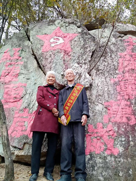 “紅軍萬歲!”“共產(chǎn)黨萬歲!”10月27日,湖北省羅田縣九資河鎮(zhèn)太陽寨村85歲村民王開明、洪利宜夫婦來到恢復(fù)建設(shè)的紅色遺址前合影留念,激動地喊出聲來。不久前,在北京召開的全國雙擁模范城(縣)命名暨雙擁模范單位和個人表彰大會上,王開明被表彰為“全國愛國擁軍模范”,會后他馬上帶領(lǐng)家人恢復(fù)太陽寨紅軍戰(zhàn)斗遺址建設(shè),用“刻在石頭上的革命史詩”感謝黨的恩情。
